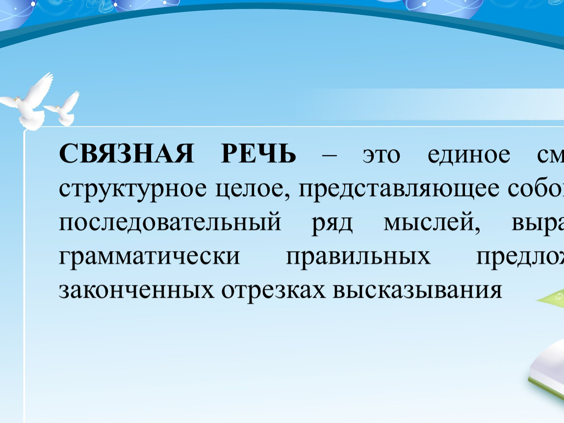 СВЯЗНАЯ РЕЧЬ – это единое смысловое и структурное целое, представляющее собой логически последовательный ряд мыслей, выраженных в грамматически правильных предложениях и законченных отрезках высказывания