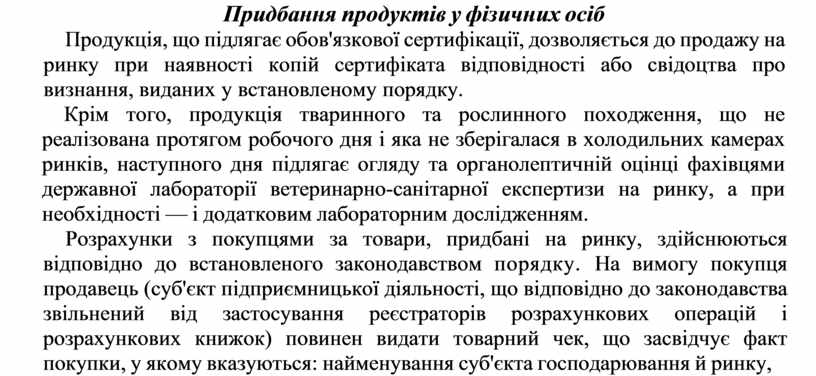 Розрахунки з покупцями за товари, придбані на ринку, здійснюються відповідно до встановленого законодавством порядку. На вимогу покупця продавець (суб'єкт підприємницької діяльності, що відповідно до законодавства звільнений від застосування реєстраторів розрахункових операцій і розрахункових книжок) повинен видати товарний чек, що засвідчує факт покупки, у якому вказуються: найменування суб'єкта господарювання й ринку,