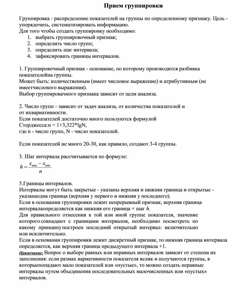 Примечание: Вопрос о выборе равных или неравных интервалов зависит от степени их заполнения: если размах вариативности показателя велик и получаются группы, в которые попадают мало показателей или «пустые», то можно создать неравные интервалы путем объединения последовательных малочисленных или «пустых» интервалов.