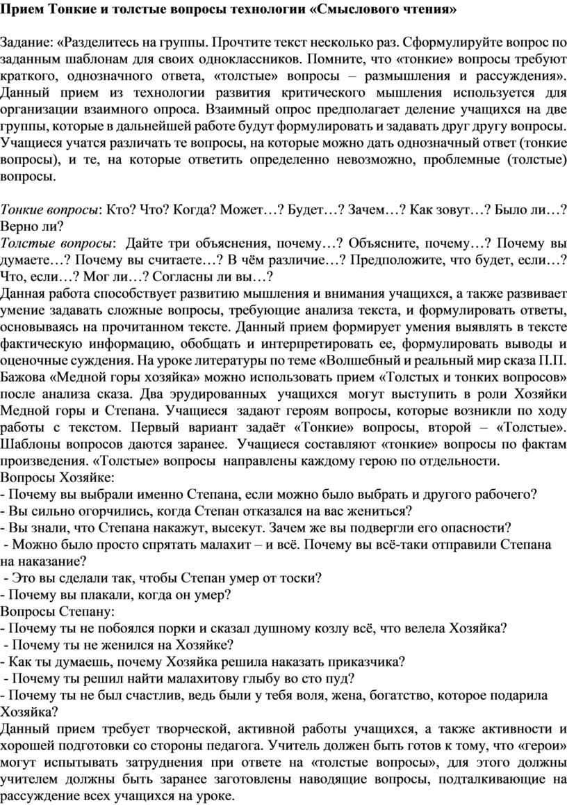 Данная работа способствует развитию мышления и внимания учащихся, а также развивает умение задавать сложные вопросы, требующие анализа текста, и формулировать ответы, основываясь на прочитанном тексте. Данный прием формирует умения выявлять в тексте фактическую информацию, обобщать и интерпретировать ее, формулировать выводы и оценочные суждения. На уроке литературы по теме «Волшебный и реальный мир сказа П.П. Бажова «Медной горы хозяйка» можно использовать прием «Толстых и тонких вопросов» после анализа сказа. Два эрудированных учащихся могут выступить в роли Хозяйки Медной горы и Степана. Учащиеся задают героям вопросы, которые возникли по ходу работы с текстом. Первый вариант задаёт «Тонкие» вопросы, второй – «Толстые». Шаблоны вопросов даются заранее. Учащиеся составляют «тонкие» вопросы по фактам произведения. «Толстые» вопросы направлены каждому герою по отдельности.