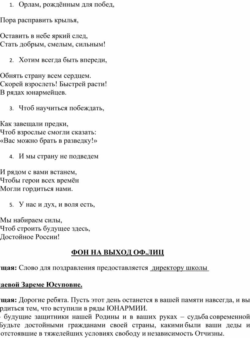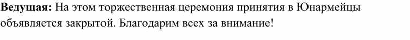 Ведущая: Именно сегодня, в этот праздничный день, вы, ребята, вступаете в ряды Всероссийского военно-патриотического общественного движения “ЮНАРМИЯ”! Сегодня вы дадите клятву на верность Отечеству и всему ЮНАРМЕЙСКОМУ братству!