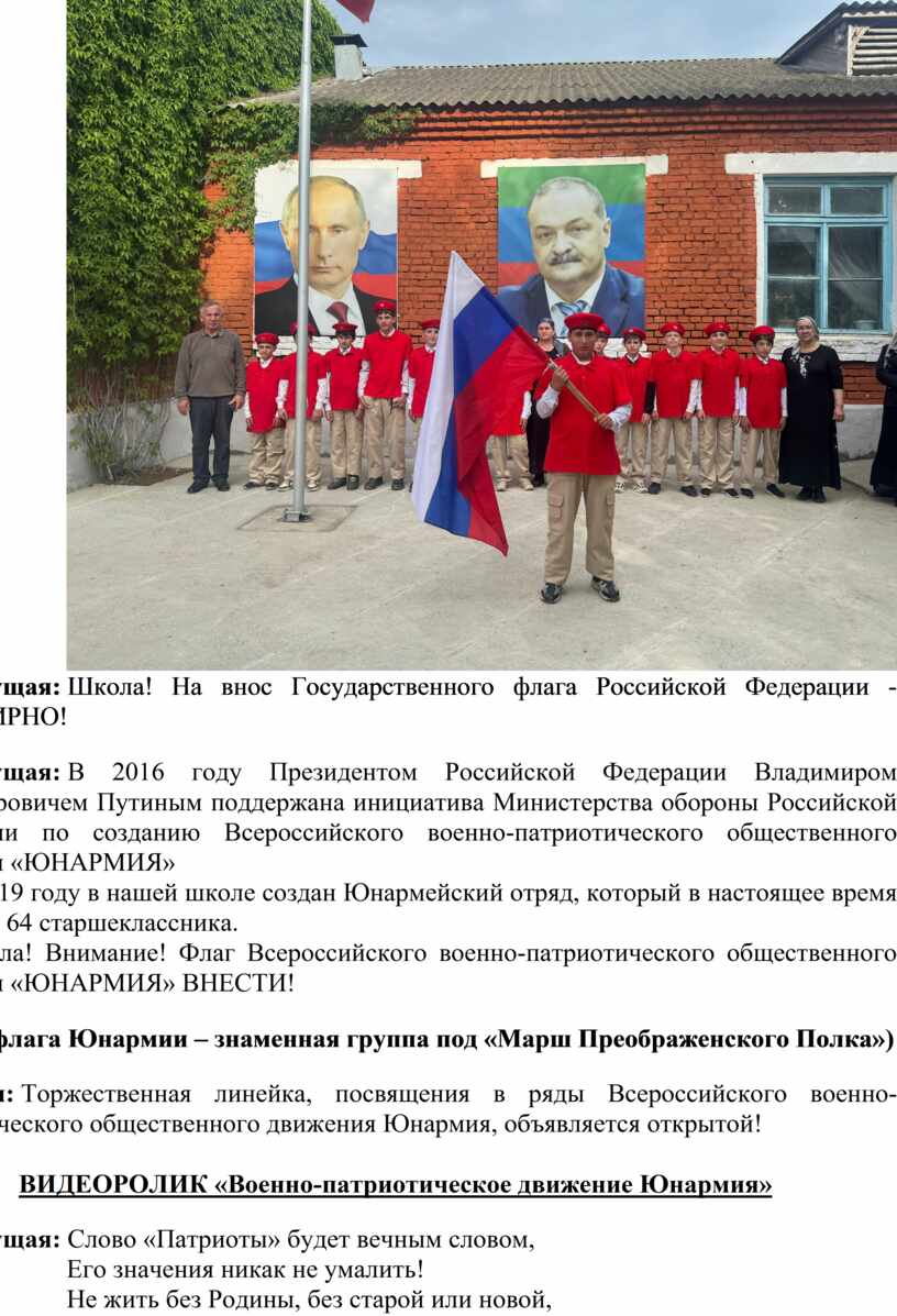 Ведущая: Торжественная линейка, посвящения в ряды Всероссийского военно-патриотического общественного движения Юнармия, объявляется открытой!