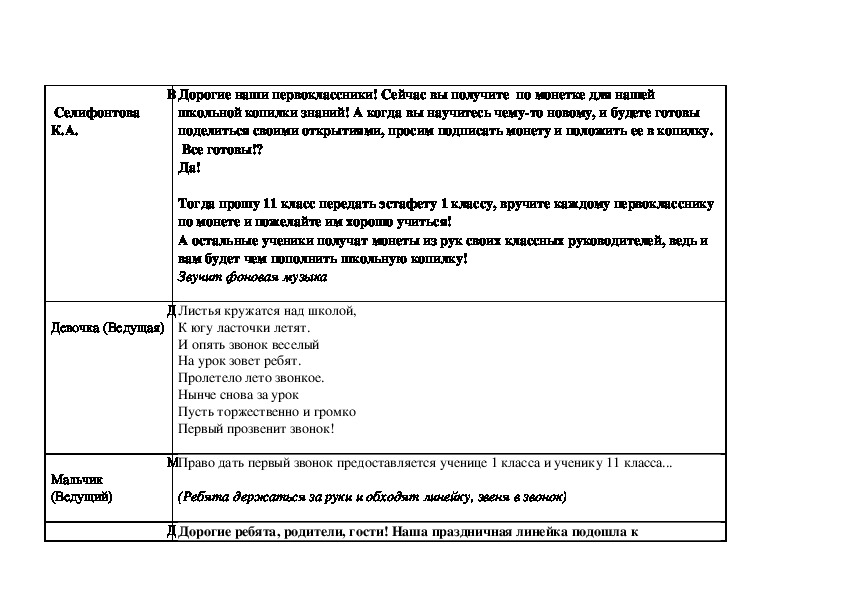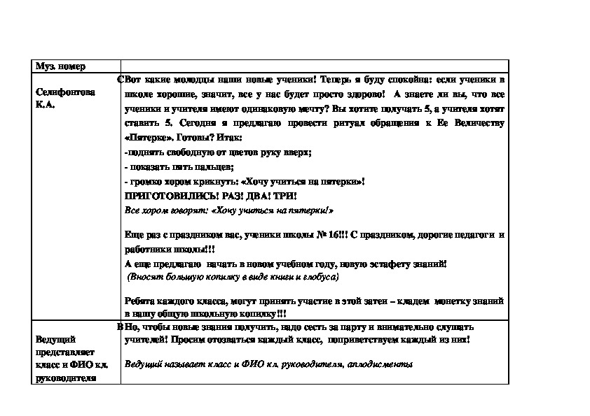 Ведущий называет класс и ФИО кл. руководителя, аплодисментыСелифонтова