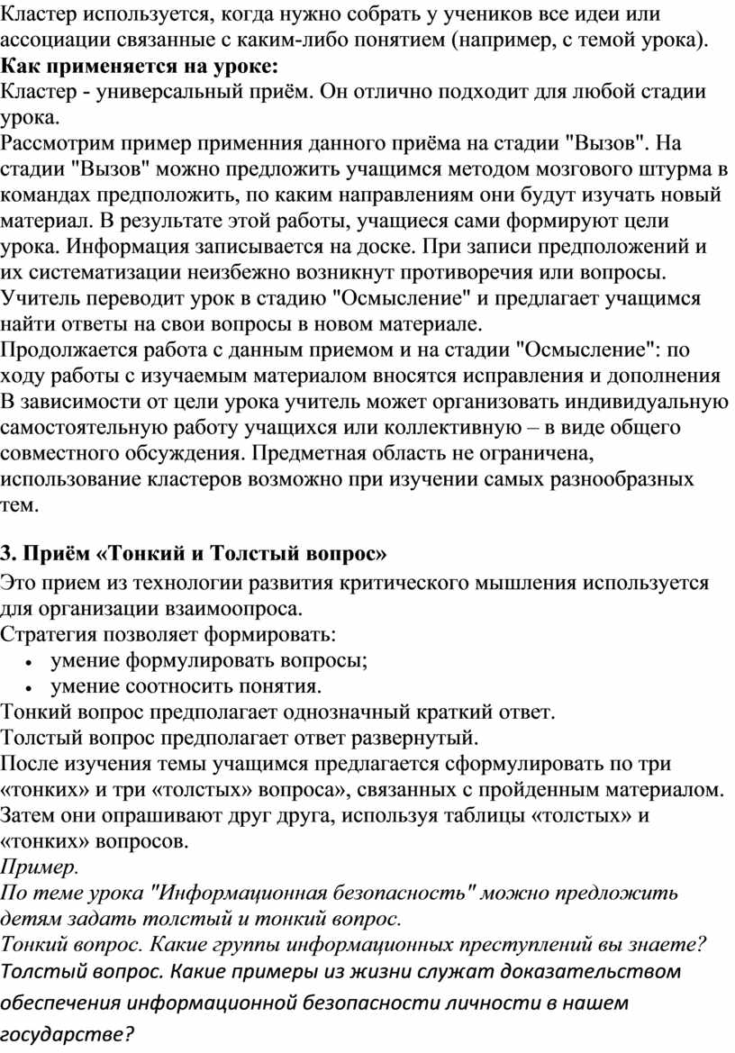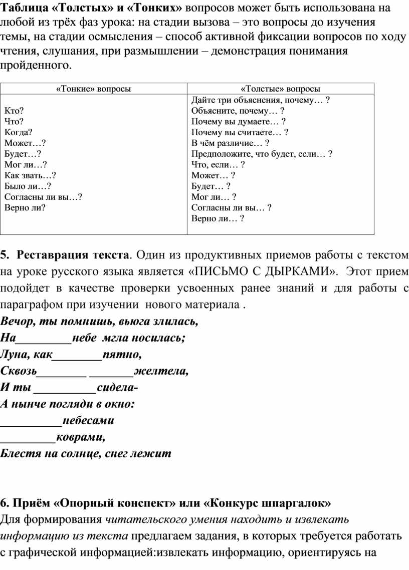 После изучения темы учащимся предлагается сформулировать по три «тонких» и три «толстых» вопроса», связанных с пройденным материалом. Затем они опрашивают друг друга, используя таблицы «толстых» и «тонких» вопросов.