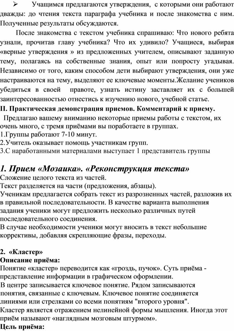 Предлагаю вашему вниманию некоторые приемы работы с текстом, их очень много, с тремя приёмами вы поработаете в группах.