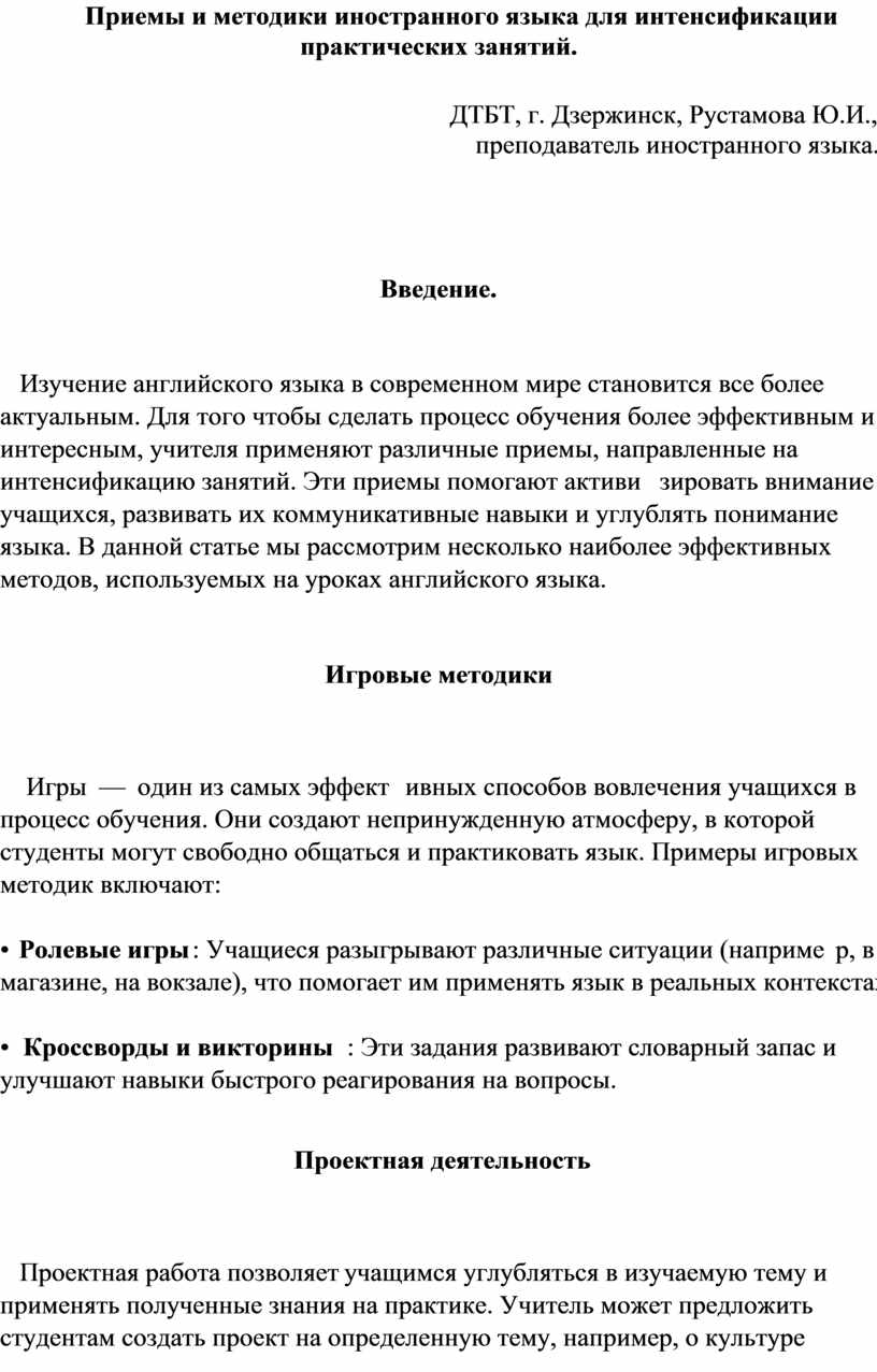 Приемы и методики иностранного языка для интенсификации практических занятий.
