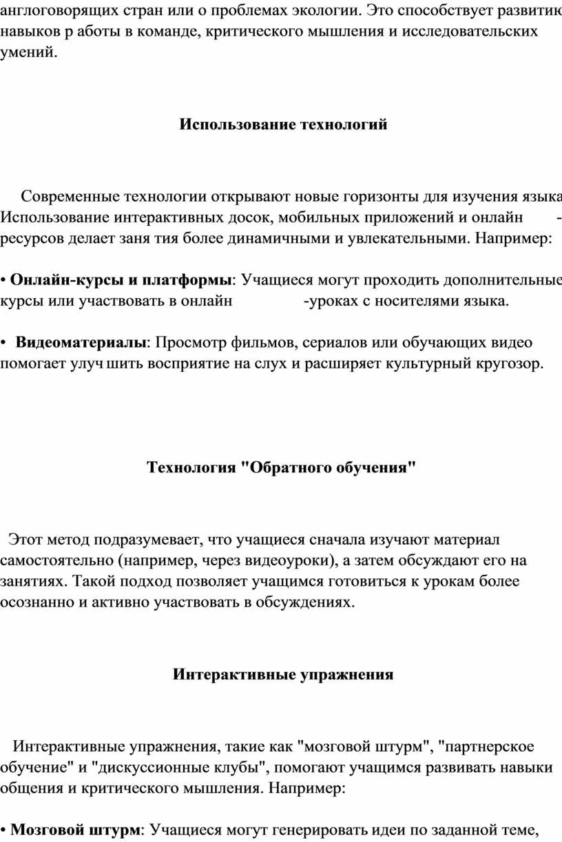 Итак, разнообразие методов обучения способствует не только улучшению языковых навыков, но и развитию личности учащихся, что является ключевым аспектом современного образования.