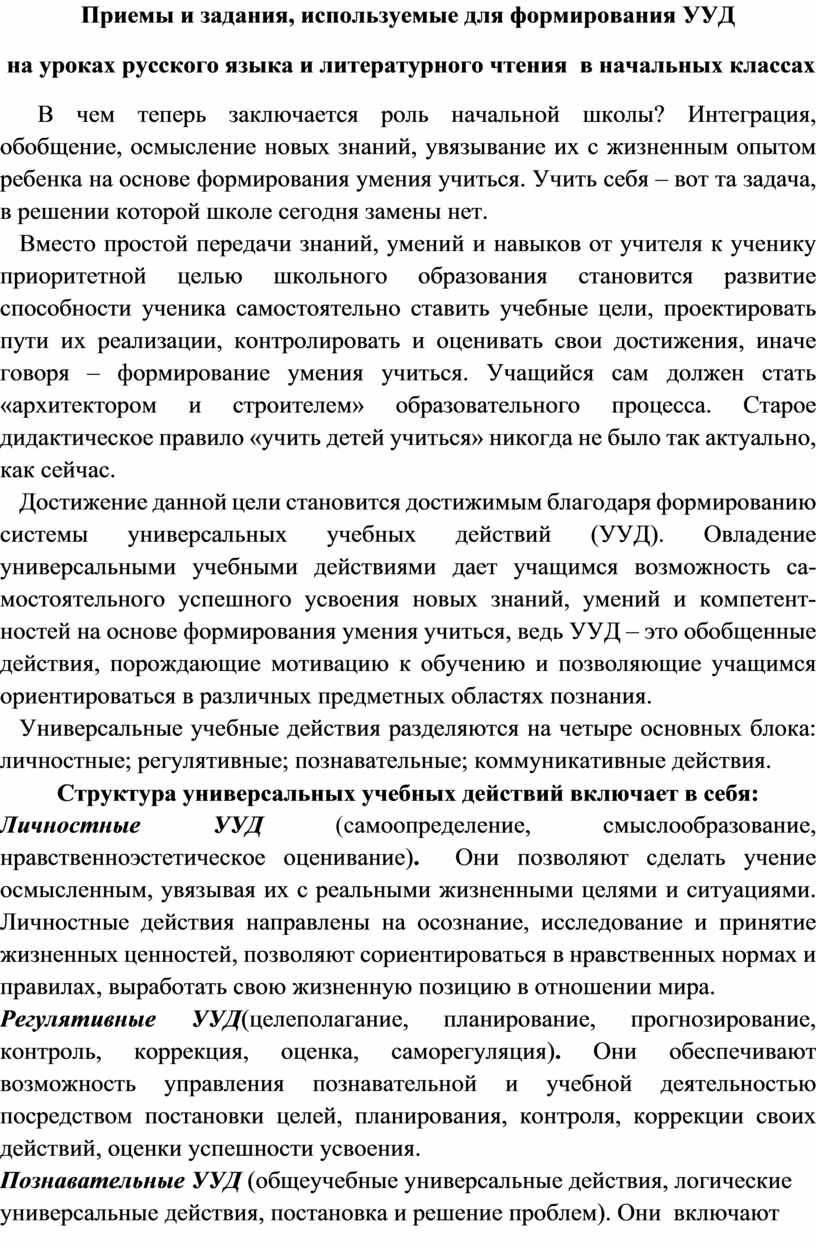 Для формирования УУД на уроках использую следующие приемы и задания: