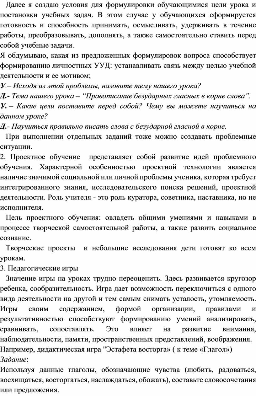 Это только небольшая часть приёмов и методов работы над УУД, которые применяю на уроках. Если описанный вид работы относится, например, к группе регулятивных, это не значит, что другие виды УУД здесь не формируются. Хочу подчеркнуть, что они тесно взаимосвязаны и формирование всех УУД происходит на всех этапах урока.