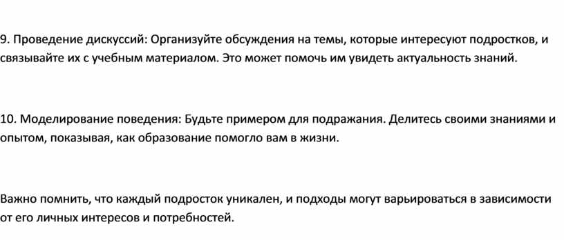 Важно помнить, что каждый подросток уникален, и подходы могут варьироваться в зависимости от его личных интересов и потребностей.