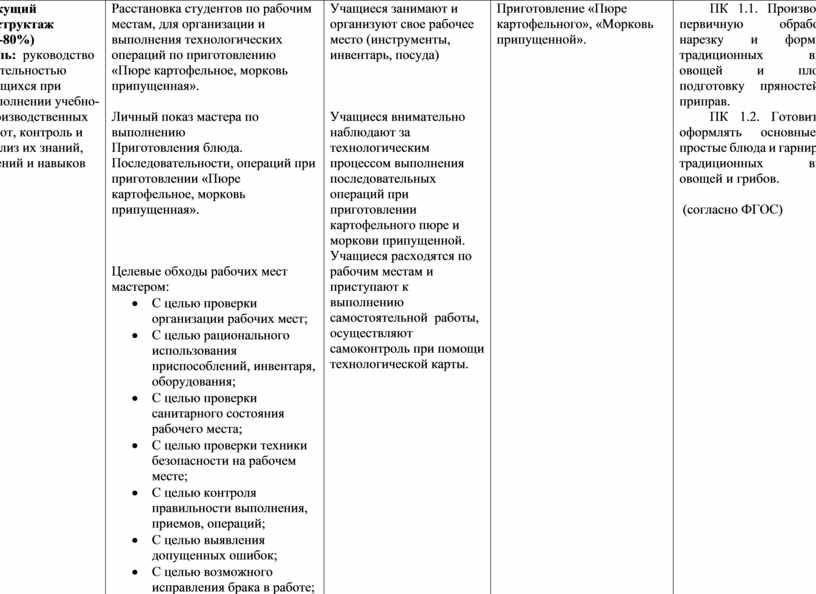 Учащиеся внимательно наблюдают за технологическим процессом выполнения последовательных операций при приготовлении картофельного пюре и моркови припущенной. Учащиеся расходятся по рабочим местам и приступают к выполнению самостоятельной работы, осуществляют самоконтроль при помощи технологической карты.