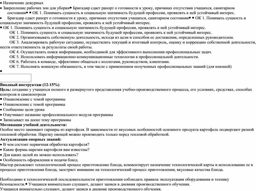 · Ознакомление с темой программы · Сообщение цели урока · Озвучивает название профессионального модуля программы · Записывает на доске тему программы Мотивация учебной деятельности: Особое место занимают гарниры из картофеля. В зависимости от вкусовых особенностей основного продукта картофель подвергают разной тепловой обработки. Нарезку овощей можно производить только перед тепловой обработкой. Актуализация опорных знаний: · В чем состоит первичная обработка картофеля? · Какие формы нарезки картофеля вам известны? · Для каких целей их можно использовать? · Особенность оформления и подачи блюд. Мастер разъясняет технологический процесс приготовление блюда, комментирует назначение технологической карты и использование ее в процессе приготовления блюда, заостряет внимание на технологический процесс приготовления, вкусовые качества блюда.