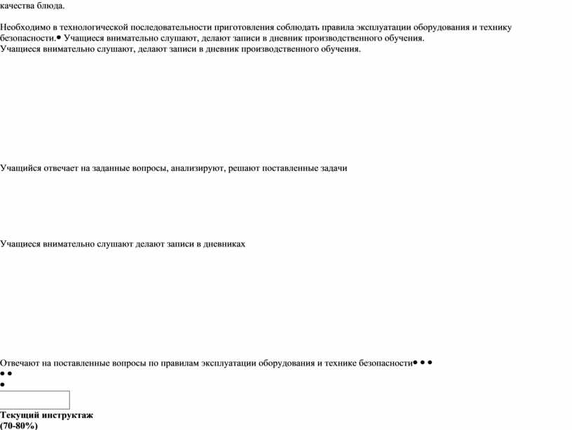 Необходимо в технологической последовательности приготовления соблюдать правила эксплуатации оборудования и технику безопасности. |