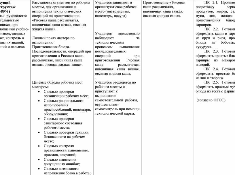 ПК 2.1. Производить подготовку зерновых продуктов, жиров, сахара, муки, яиц, молока для приготовления блюд и гарниров. ПК 2.2. Готовить и оформлять каши и гарниры из круп и риса, простые блюда из бобовых и кукурузы. ПК 2.3. Готовить и оформлять простые блюда и гарниры из макаронных изделий. ПК 2.4. Готовить и оформлять простые блюда из яиц и творога. ПК 2.5. Готовить и оформлять простые мучные блюда из теста с фаршем.