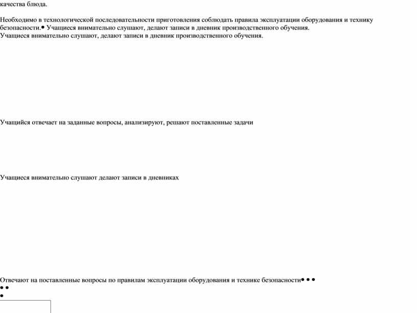Необходимо в технологической последовательности приготовления соблюдать правила эксплуатации оборудования и технику безопасности. |