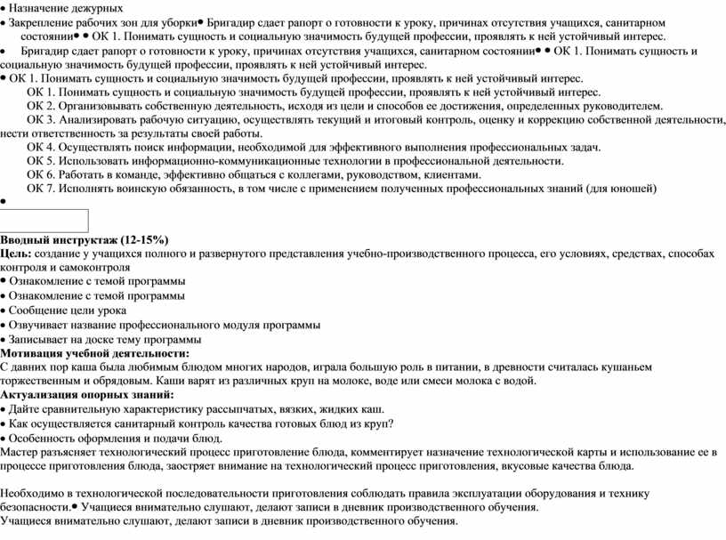 · Ознакомление с темой программы · Сообщение цели урока · Озвучивает название профессионального модуля программы · Записывает на доске тему программы Мотивация учебной деятельности: С давних пор каша была любимым блюдом многих народов, играла большую роль в питании, в древности считалась кушаньем торжественным и обрядовым. Каши варят из различных круп на молоке, воде или смеси молока с водой. Актуализация опорных знаний: · Дайте сравнительную характеристику рассыпчатых, вязких, жидких каш. · Как осуществляется санитарный контроль качества готовых блюд из круп? · Особенность оформления и подачи блюд. Мастер разъясняет технологический процесс приготовление блюда, комментирует назначение технологической карты и использование ее в процессе приготовления блюда, заостряет внимание на технологический процесс приготовления, вкусовые качества блюда.