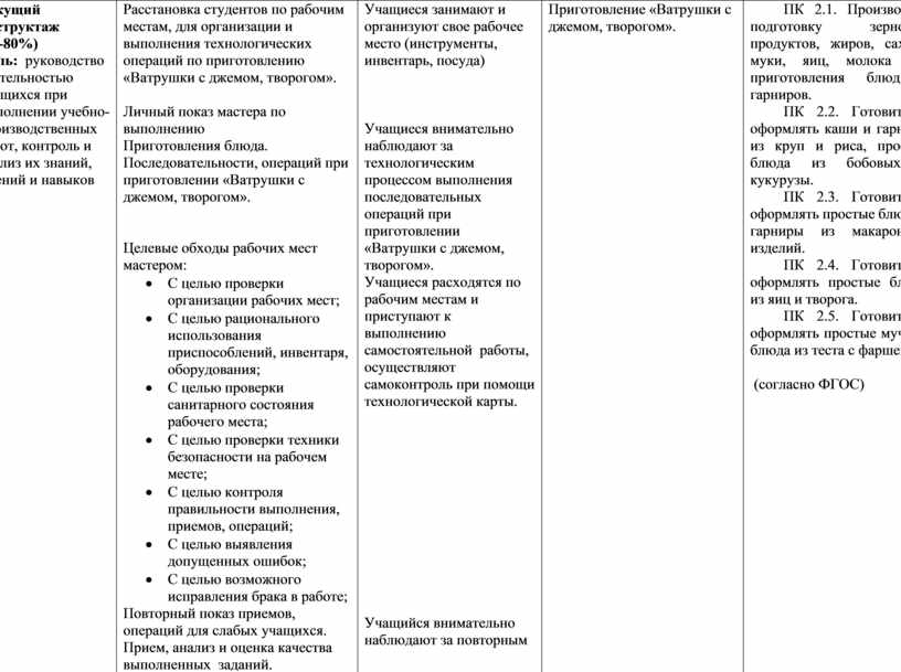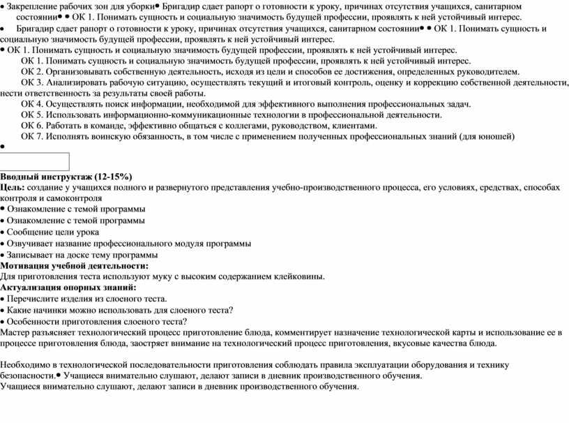 · Ознакомление с темой программы · Сообщение цели урока · Озвучивает название профессионального модуля программы · Записывает на доске тему программы Мотивация учебной деятельности: Для приготовления теста используют муку с высоким содержанием клейковины. Актуализация опорных знаний: · Перечислите изделия из слоеного теста. · Какие начинки можно использовать для слоеного теста? · Особенности приготовления слоеного теста? Мастер разъясняет технологический процесс приготовление блюда, комментирует назначение технологической карты и использование ее в процессе приготовления блюда, заостряет внимание на технологический процесс приготовления, вкусовые качества блюда.
