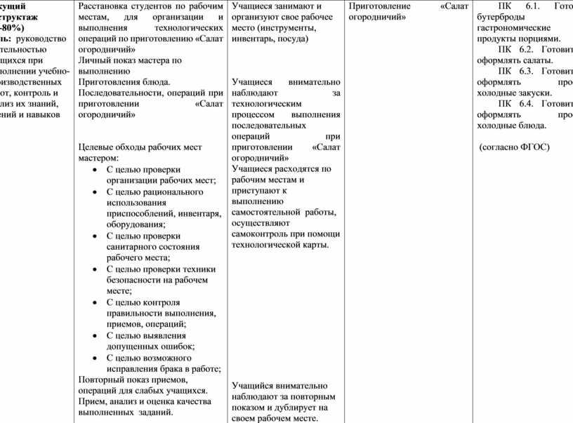 Расстановка студентов по рабочим местам, для организации и выполнения технологических операций по приготовлению «Салат огородничий» Личный показ мастера по выполнению Приготовления блюда. Последовательности, операций при приготовлении «Салат огородничий»