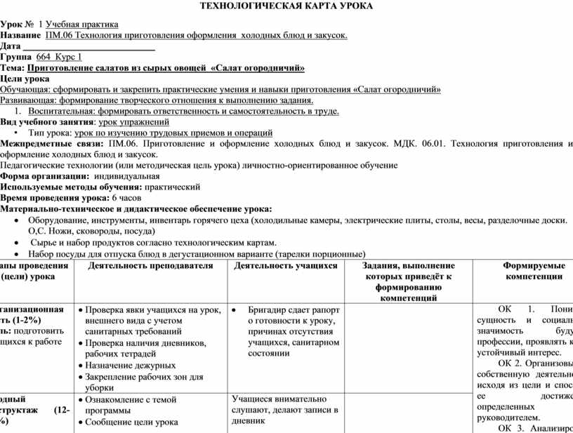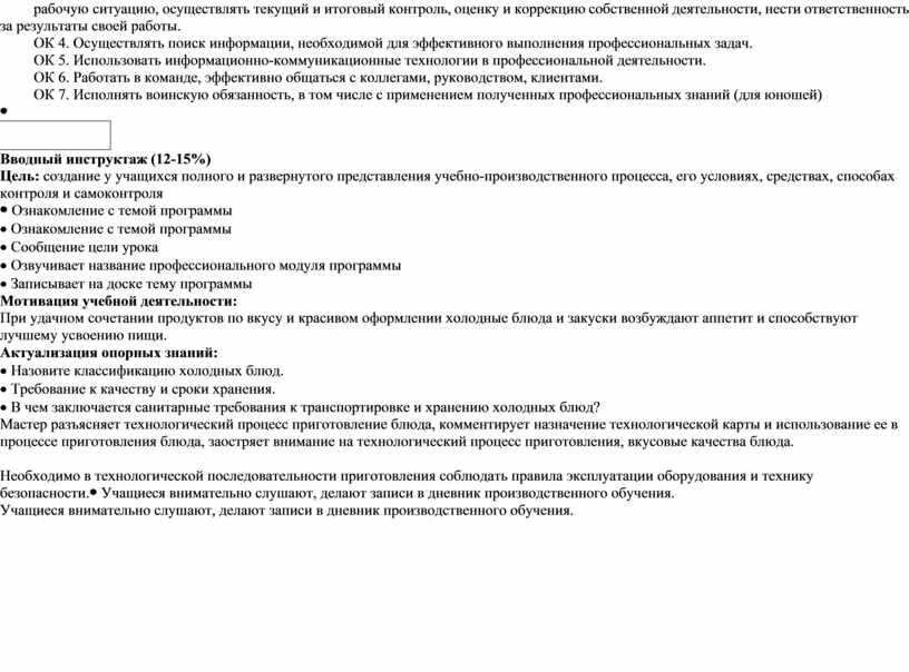 · Ознакомление с темой программы · Сообщение цели урока · Озвучивает название профессионального модуля программы · Записывает на доске тему программы Мотивация учебной деятельности: При удачном сочетании продуктов по вкусу и красивом оформлении холодные блюда и закуски возбуждают аппетит и способствуют лучшему усвоению пищи. Актуализация опорных знаний: · Назовите классификацию холодных блюд. · Требование к качеству и сроки хранения. · В чем заключается санитарные требования к транспортировке и хранению холодных блюд? Мастер разъясняет технологический процесс приготовление блюда, комментирует назначение технологической карты и использование ее в процессе приготовления блюда, заостряет внимание на технологический процесс приготовления, вкусовые качества блюда.
