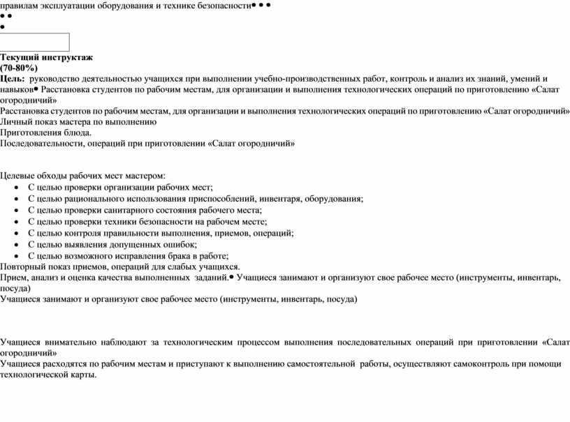 Текущий инструктаж (70-80%) Цель: руководство деятельностью учащихся при выполнении учебно-производственных работ, контроль и анализ их знаний, умений и навыков |