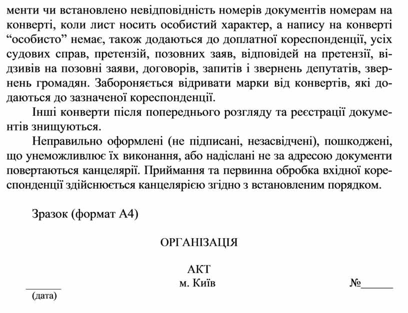 У разі необхідності канцелярія складає акт у двох примірниках: перший разом з документом надсилається відправнику, а другий за- лишається у канцелярії (див. зразок нижче).