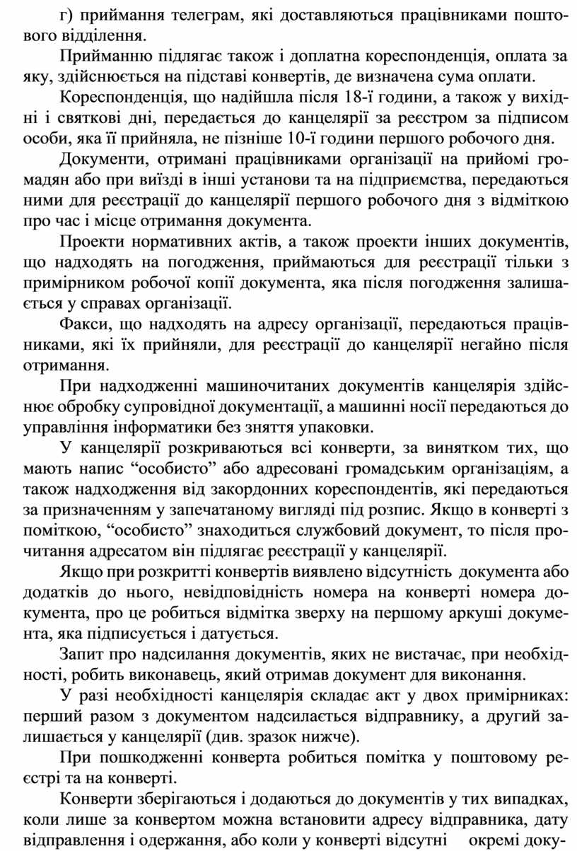 У канцелярії розкриваються всі конверти, за винятком тих, що мають напис “особисто” або адресовані громадським організаціям, а також надходження від закордонних кореспондентів, які передаються за призначенням у запечатаному вигляді під розпис. Якщо в конверті з поміткою, “особисто” знаходиться службовий документ, то після про- читання адресатом він підлягає реєстрації у канцелярії.