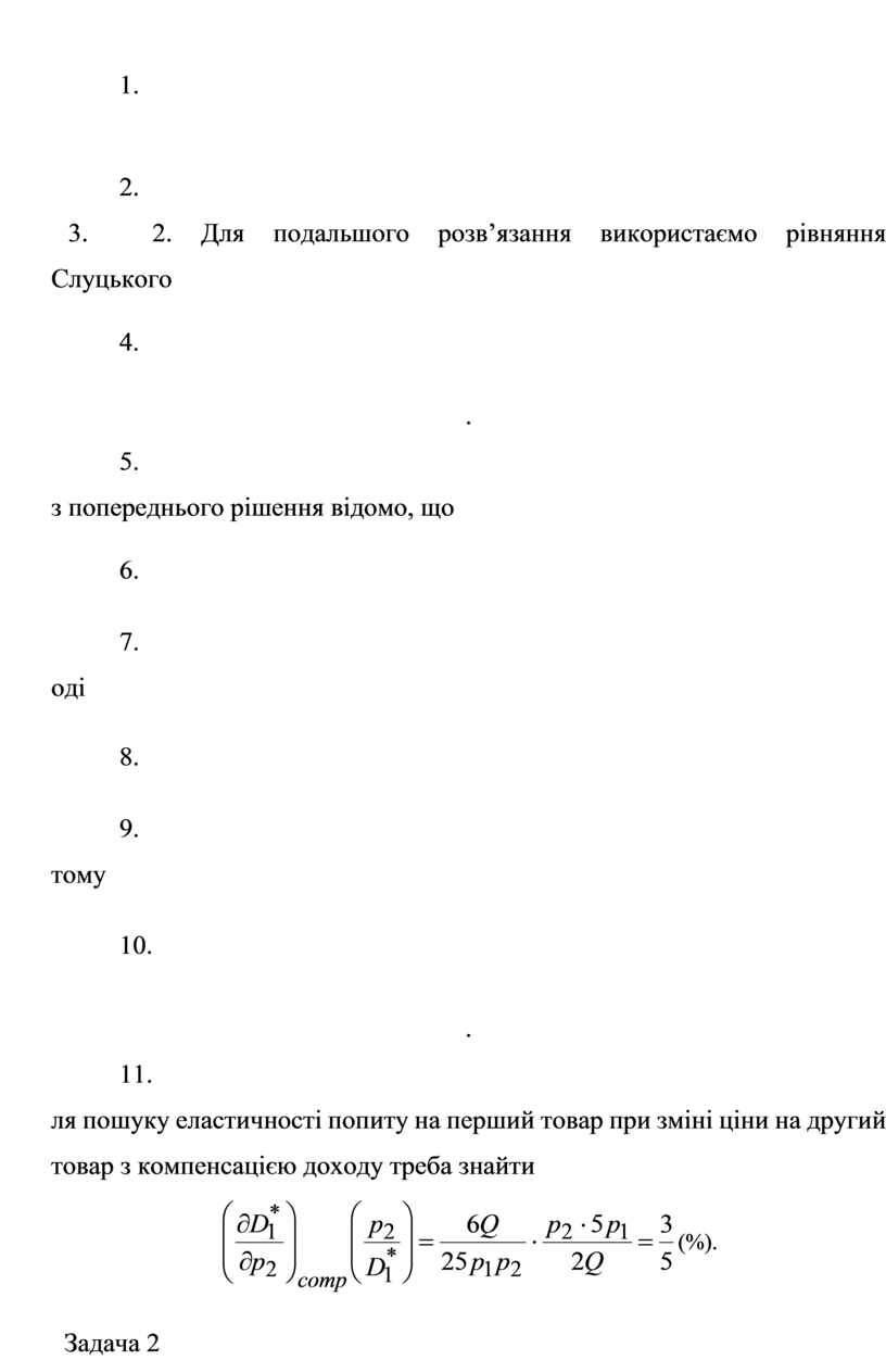 2. Знайти на скільки процентів зміниться попит на перший товар при збільшенні ціни на другий товар на 1% з компенсацією доходу. Відповідь дати у загальному вигляді та знайти число для визначеного вектору попиту. Використати рівняння Слуцького.