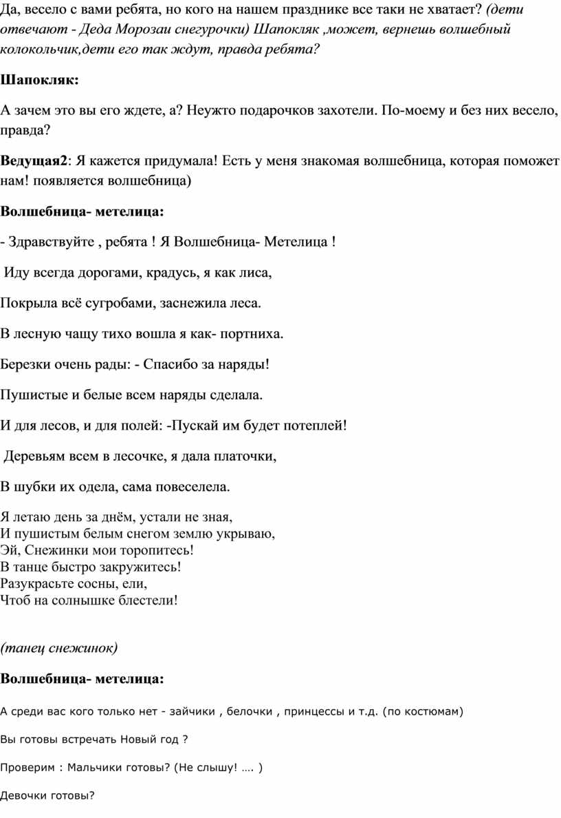 Ведущая2: Здравствуйте Волшебница-метелица! Помоги нам, пожалуйста, найти путь-дорожку в царство Деда Мороза и Снегурочки. Злодейка Шапокляк, решила испортить детям праздник, и украла волшебный колокольчик.