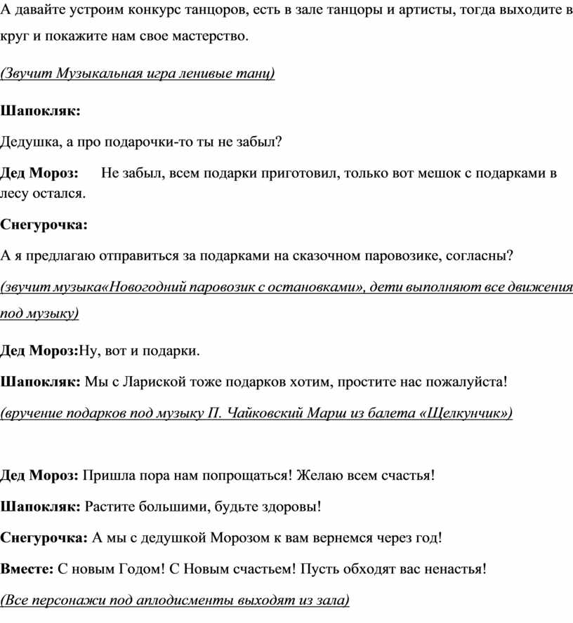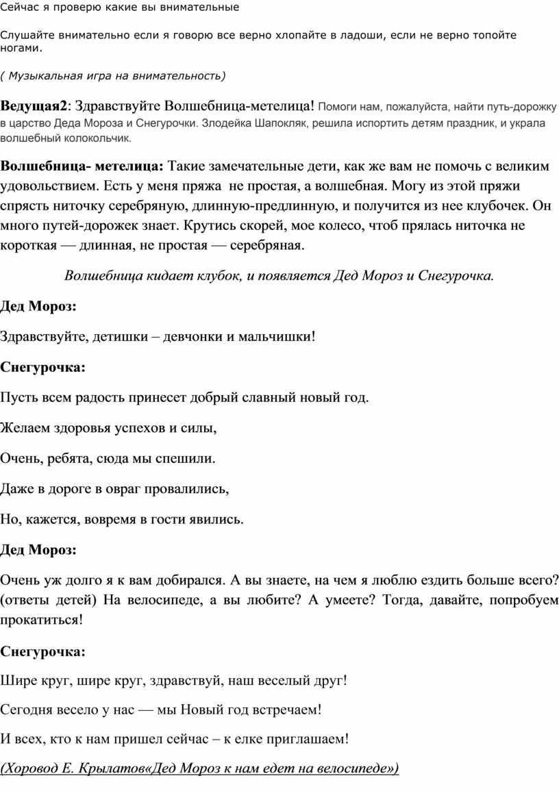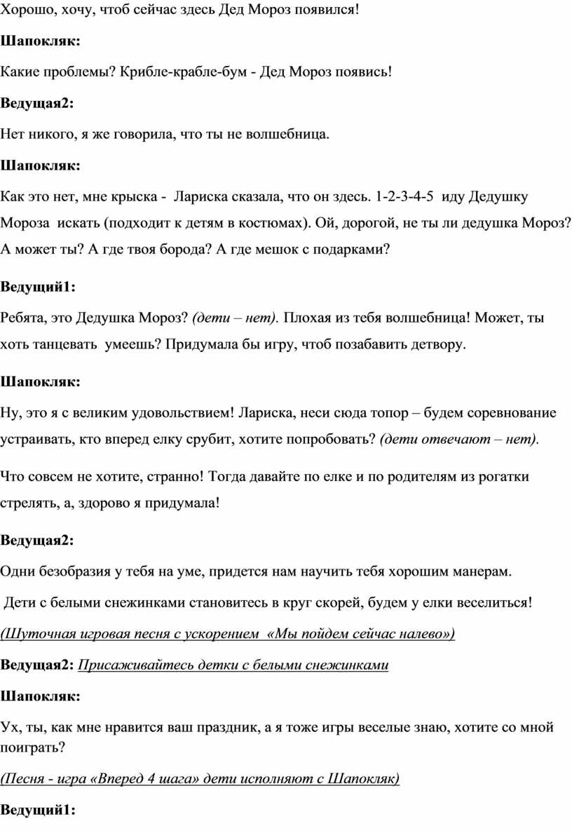 Как это нет, мне крыска - Лариска сказала, что он здесь. 1-2-3-4-5 иду Дедушку Мороза искать (подходит к детям в костюмах). Ой, дорогой, не ты ли дедушка Мороз? А может ты? А где твоя борода? А где мешок с подарками?