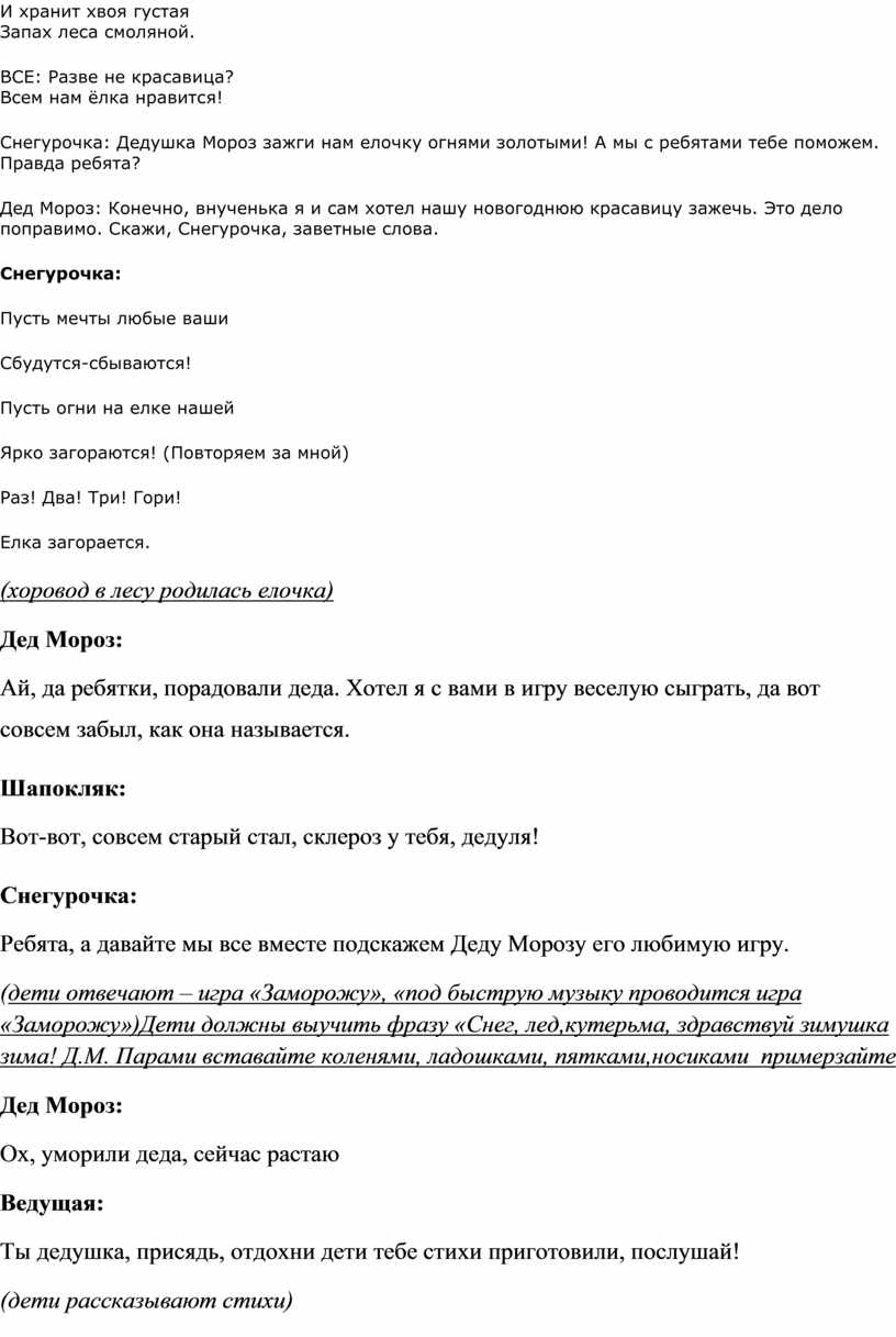 Дед Мороз: Конечно, внученька я и сам хотел нашу новогоднюю красавицу зажечь. Это дело поправимо. Скажи, Снегурочка, заветные слова.