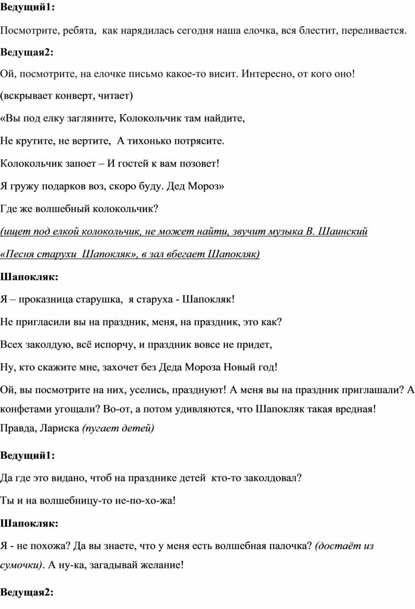 Да, весело с вами ребята, но кого на нашем празднике все таки не хватает? (дети отвечают - Деда Морозаи снегурочки) Шапокляк ,может, вернешь волшебный колокольчик,дети его так ждут, правда ребята?