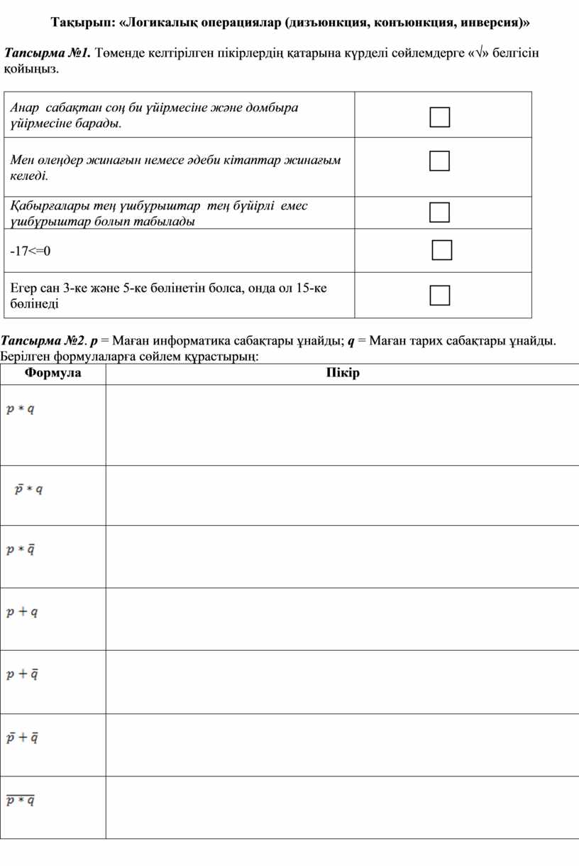 Тақырып: «Логикалық операциялар (дизъюнкция, конъюнкция, инверсия)»