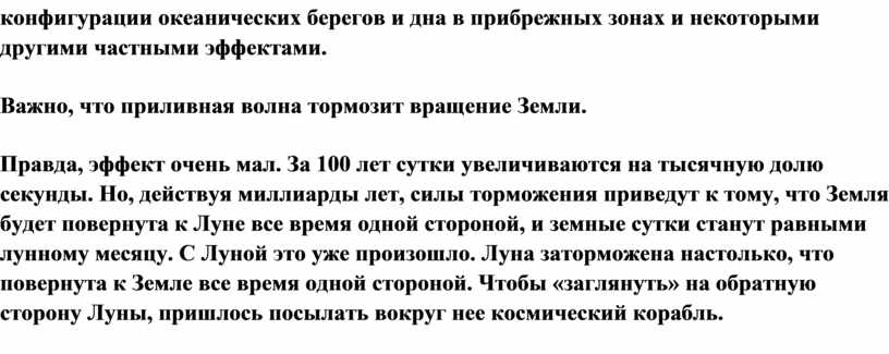 Правда, эффект очень мал. За 100 лет сутки увеличиваются на тысячную долю секунды. Но, действуя миллиарды лет, силы торможения приведут к тому, что Земля будет повернута к Луне все время одной стороной, и земные сутки станут равными лунному месяцу. С Луной это уже произошло. Луна заторможена настолько, что повернута к Земле все время одной стороной. Чтобы «заглянуть» на обратную сторону Луны, пришлось посылать вокруг нее космический корабль.