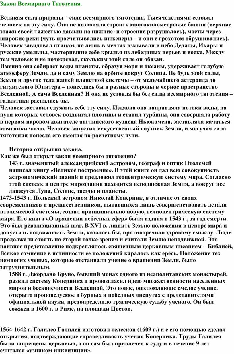 1564-1642 г. Галилео Галилей изготовил телескоп (1609 г.) и с его помощью сделал открытия, подтверждающие справедливость учения Коперника. Труды Галилея были запрещены церковью, а он сам был привлечен к суду и в течение 9 лет считался «узником инквизиции».