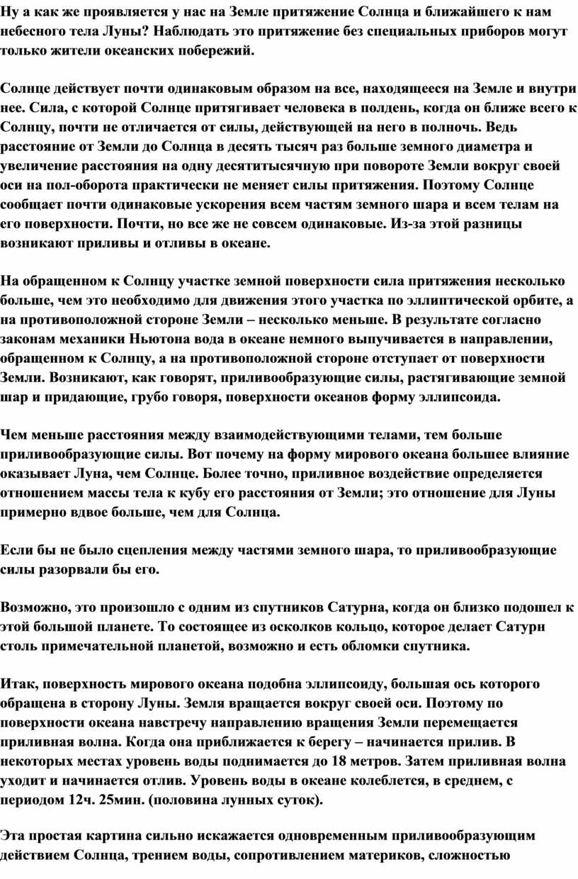Ну а как же проявляется у нас на Земле притяжение Солнца и ближайшего к нам небесного тела Луны? Наблюдать это притяжение без специальных приборов могут только жители океанских побережий.