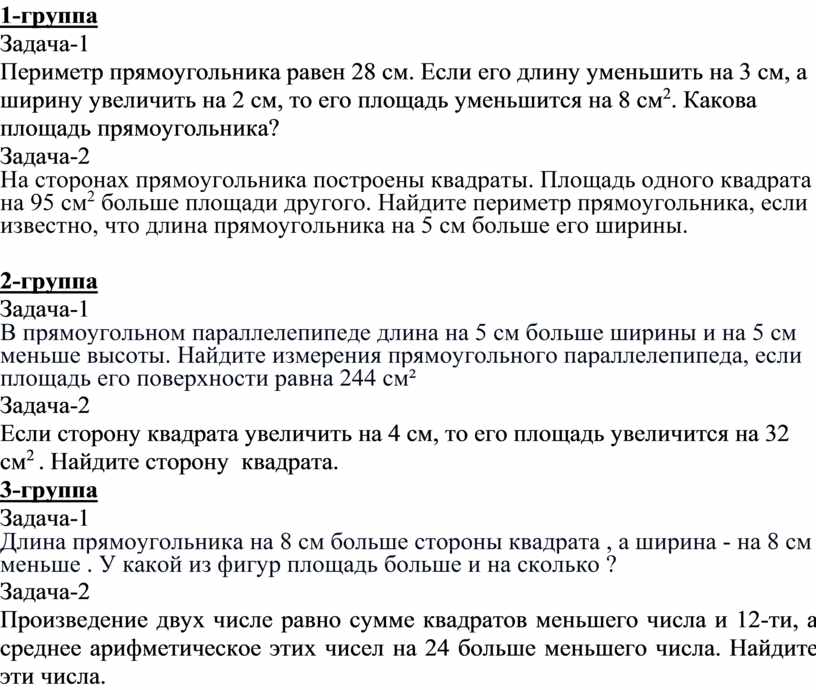 Периметр прямоугольника равен 28 см. Если eгo длину уменьшить на 3 см, а ширину увеличить на 2 см, то eгo площадь уменьшится на 8 см2. Какова площадь прямоугольника?