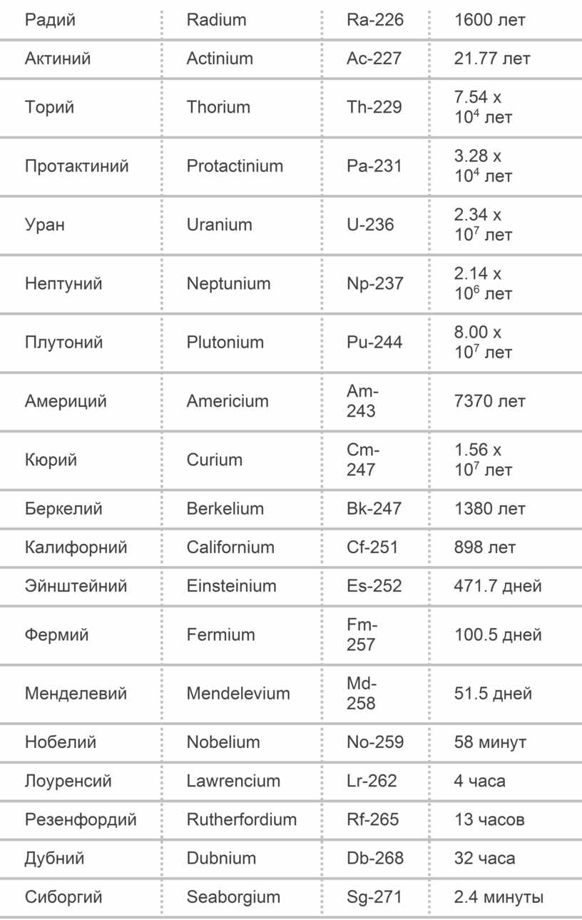 Все радиоактивные металлы со временем распадаются и превращаются в стабильные элементы (иногда проходя целую цепочку превращений). У разных элементов радиоактивный распад может длиться от нескольких миллисекунд до нескольких тысяч лет.