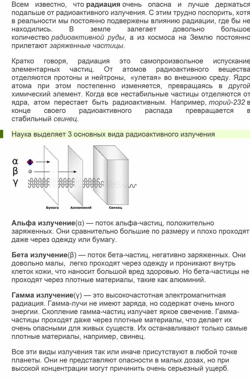 Альфа излучение(α) — поток альфа-частиц, положительно заряженных. Они сравнительно большие по размеру и плохо проходят даже через одежду или бумагу.