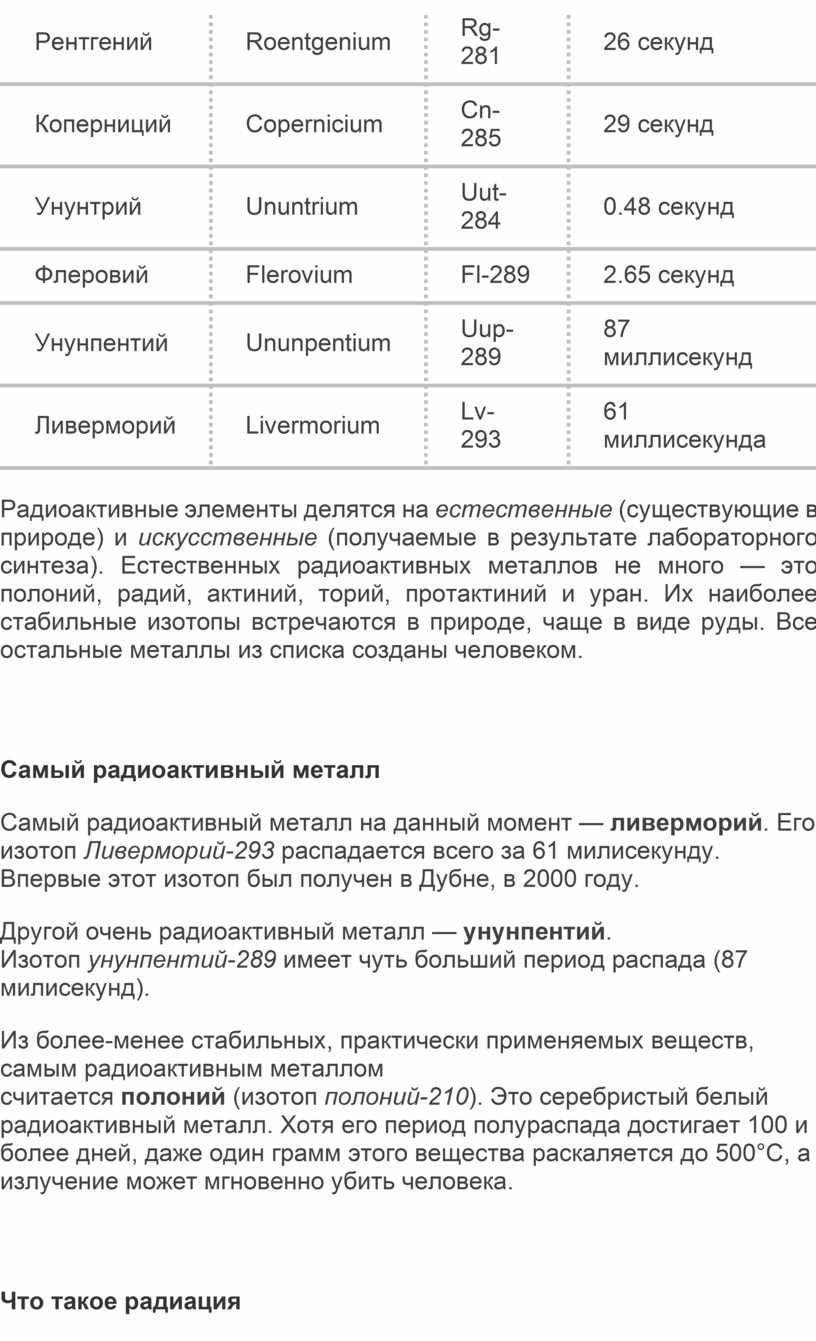 Самый радиоактивный металл на данный момент — ливерморий. Его изотоп Ливерморий-293 распадается всего за 61 милисекунду. Впервые этот изотоп был получен в Дубне, в 2000 году.
