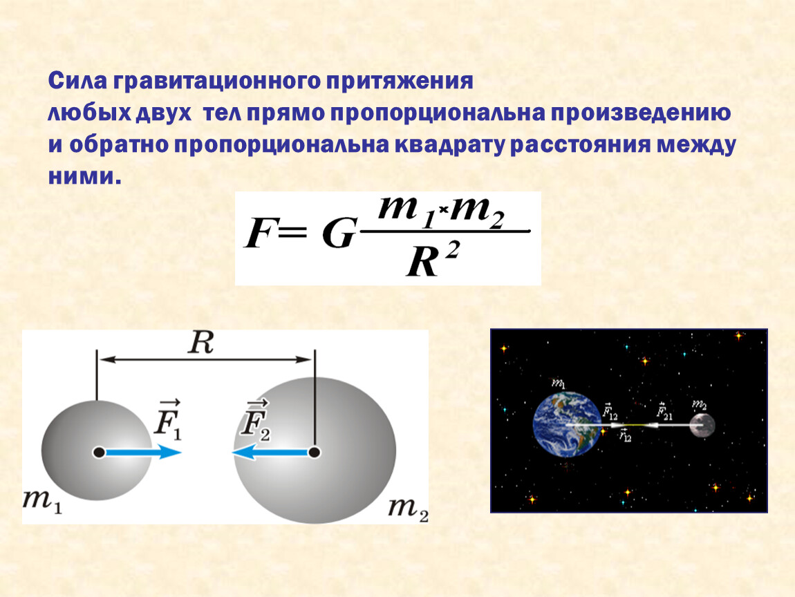 Сила гравитационного притяжения любых двух тел прямо пропорциональна произведениюи обратно пропорциональна квадрату расстояния между ними.