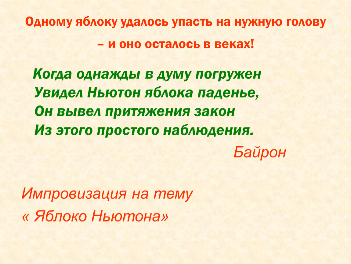 Когда однажды в думу погруженУвидел Ньютон яблока паденье,Он вывел притяжения законИз этого простого наблюдения.