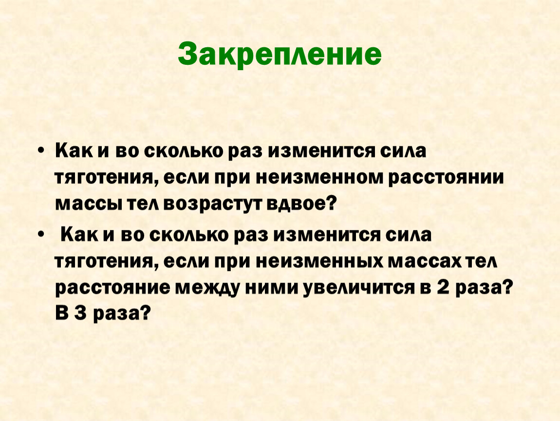 Как и во сколько раз изменится сила тяготения, если при неизменном расстоянии массы тел возрастут вдвое?