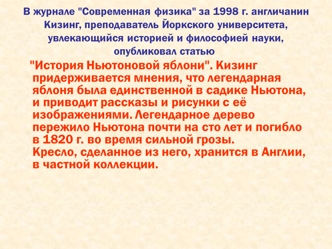 "История Ньютоновой яблони". Кизинг придерживается мнения, что легендарная яблоня была единственной в садике Ньютона, и приводит рассказы и рисунки с её изображениями. Легендарное дерево пережило Ньютона почти на сто лет и погибло в 1820 г. во время сильной грозы.Кресло, сделанное из него, хранится в Англии, в частной коллекции.