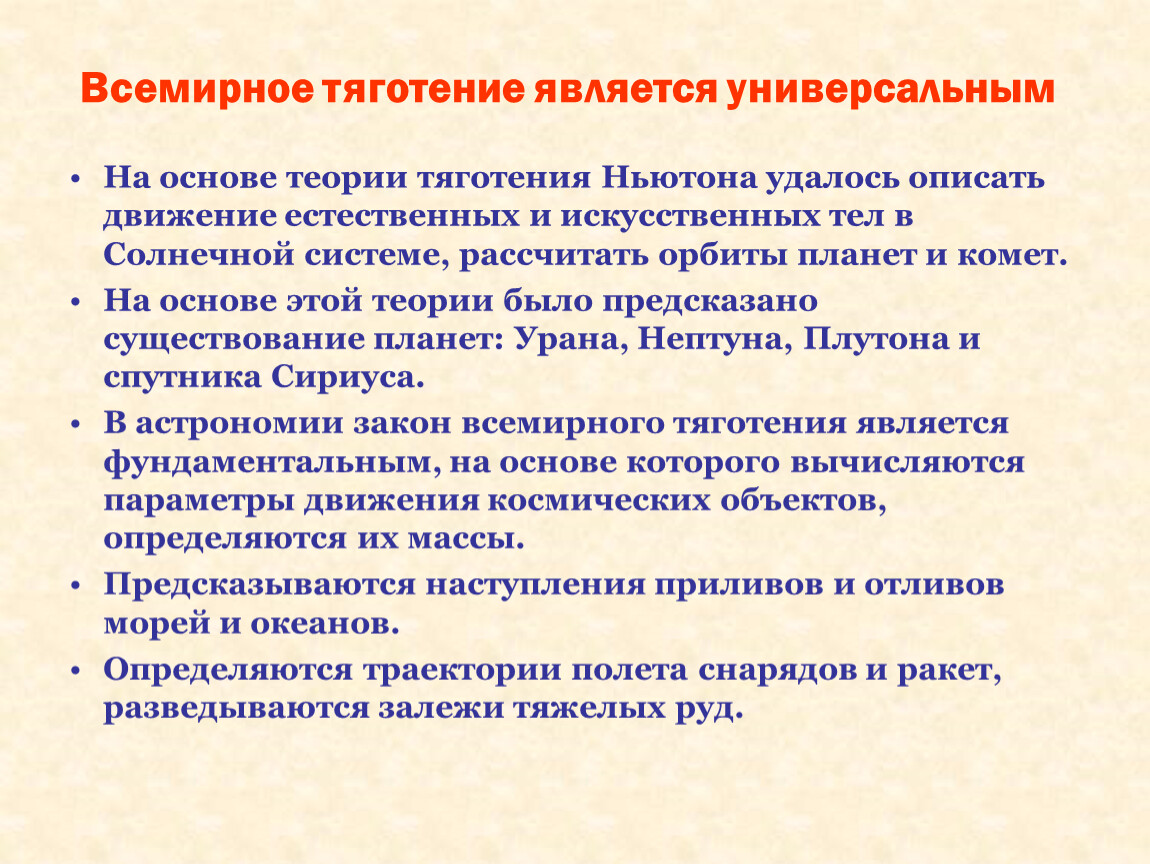 На основе теории тяготения Ньютона удалось описать движение естественных и искусственных тел в Солнечной системе, рассчитать орбиты планет и комет.