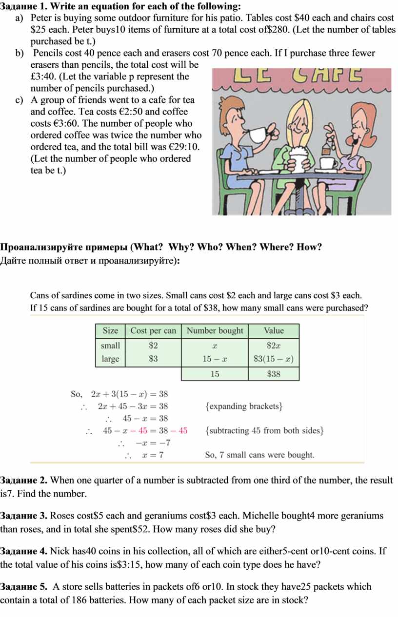 c) A group of friends went to a cafe for tea and coffee. Tea costs €2:50 and coffee costs €3:60. The number of people who ordered coffee was twice the number who ordered tea, and the total bill was €29:10. (Let the number of people who ordered tea be t.)