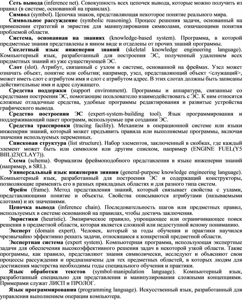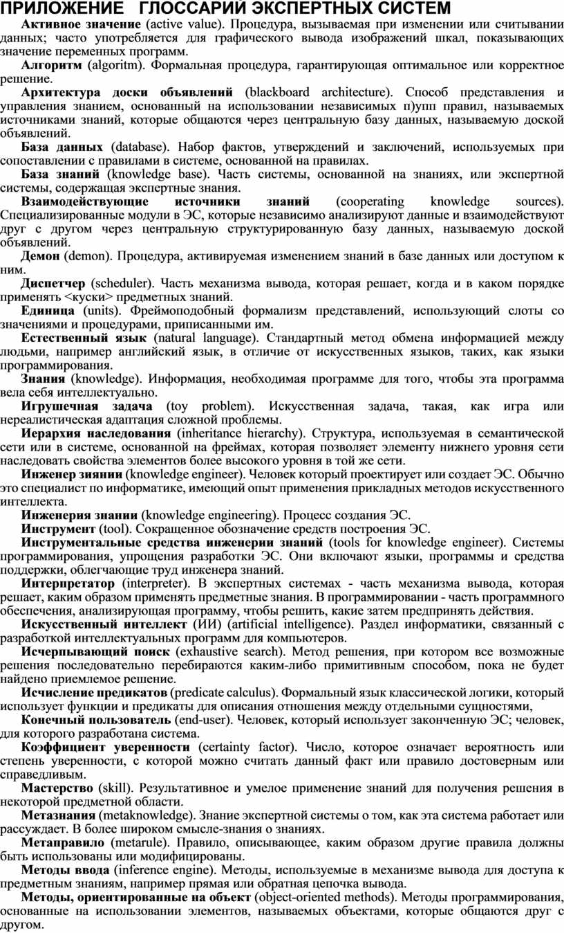 ПРИЛОЖЕНИЕ ГЛОССАРИЙ ЭКСПЕРТНЫХ СИСТЕМ