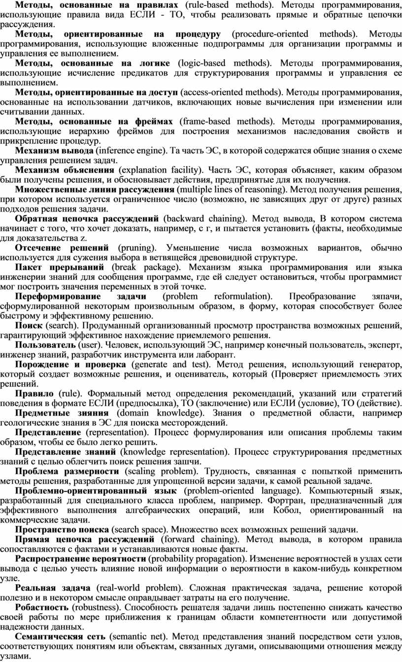 Методы, основанные на правилах (rule-based methods). Методы программирования, использующие правила вида ЕСЛИ - ТО, чтобы реализовать прямые и обратные цепочки рассуждения.