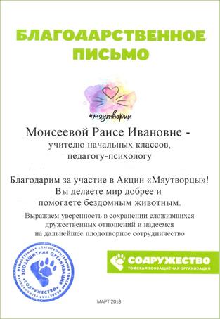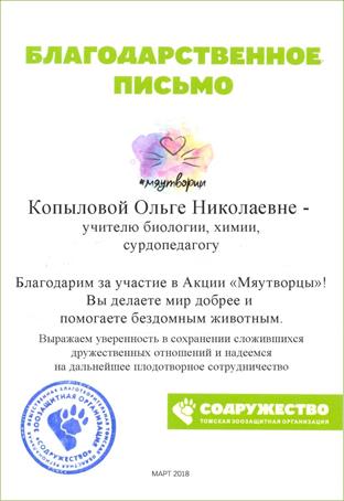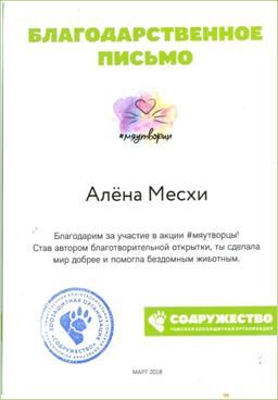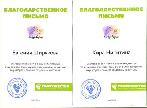 Пожертвования по акции «Помоги четвероногому другу» (материальная помощь для питомцев Томской зоозащитной организации «Содружество») в рамках проекта «Этот милый Мурлыка!»……………………… |