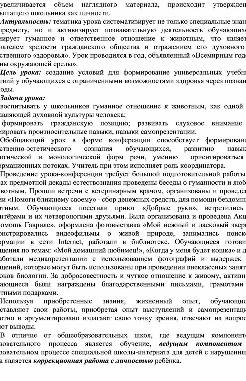 Проведение урока-конференции требует большой подготовительной работы: в рамках предметной декады естествознания проведены беседы о гуманности и любви к животным. Прошли встречи с ветеринарным врачом, организованы и проведены Акции «Помоги ближнему своему» - сбор денежных средств, для помощи бездомным животным. Обучающиеся посетили приют «Добрые руки», встретились с волонтёрами и их четвероногими друзьями. Была организована и проведена Акция «В помощь Гавриле», оформлена фотовыставка «Мой нежный и ласковый зверь». Демонстрировались видеофильмы о живой природе, занимались поиском информации в сети Internet, работали в библиотеке. Обучающиеся готовили сообщения по темам: «Мой домашний любимец!», «Когда у меня будет кошка» и др., разработали медиапрезентации с использованием фотографий и выдержек из сообщений, которые могут быть использованы при проведении внеклассных занятий и уроков биологии. За добросовестность и чуткое отношение к живому, активные обучающиеся были награждены благодарственными письмами, грамотами и памятными подарками.