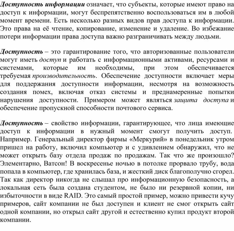 Доступность – это гарантирование того, что авторизованные пользователи могут иметь доступ и работать с информационными активами, ресурсами и системами, которые им необходимы, при этом обеспечивается требуемая производительность. Обеспечение доступности включает меры для поддержания доступности информации, несмотря на возможность создания помех, включая отказ системы и преднамеренные попытки нарушения доступности. Примером может являться защита доступа и обеспечение пропускной способности почтового сервиса.